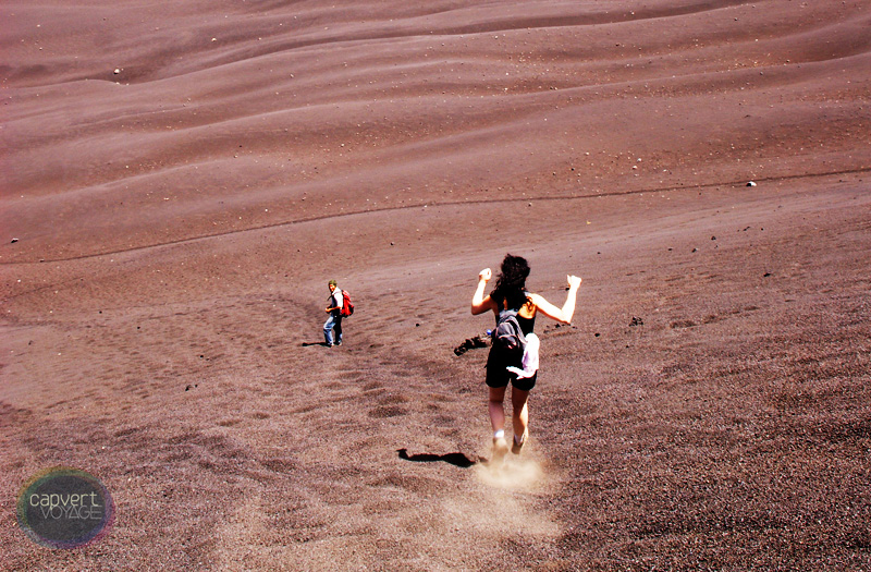 Avant l’aube nous prenons notre petit déjeuner à la bougie et nous nous restaurons avant d’entamer la plus haute étape que le Cap-Vert ait à nous proposer, à 2829 mètres. Pas à pas et avant que le soleil ne réchauffe notre chemin, nous montons le flanc du volcan. Arrivés au sommet, la première récompense est magnifique, avec une vue époustouflante sur tout le cratère et sur les champs de lave des éruptions récentes ou anciennes de plusieurs siècles. Mais la seconde récompense nous attend encore – la descente, moment inoubliable pour qui a eu la chance de dévaler cette pente de poudreuse noire !